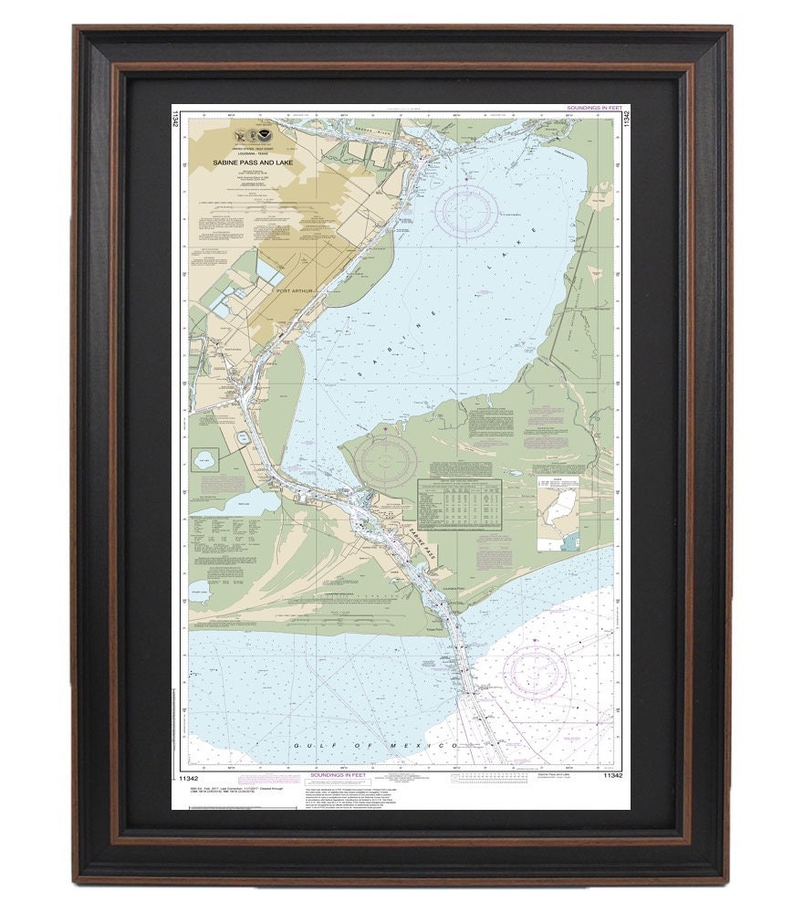 Framed Nautical Chart 11342 - Sabine Pass and Lake. NOAA 11342. Handmade in the USA.
