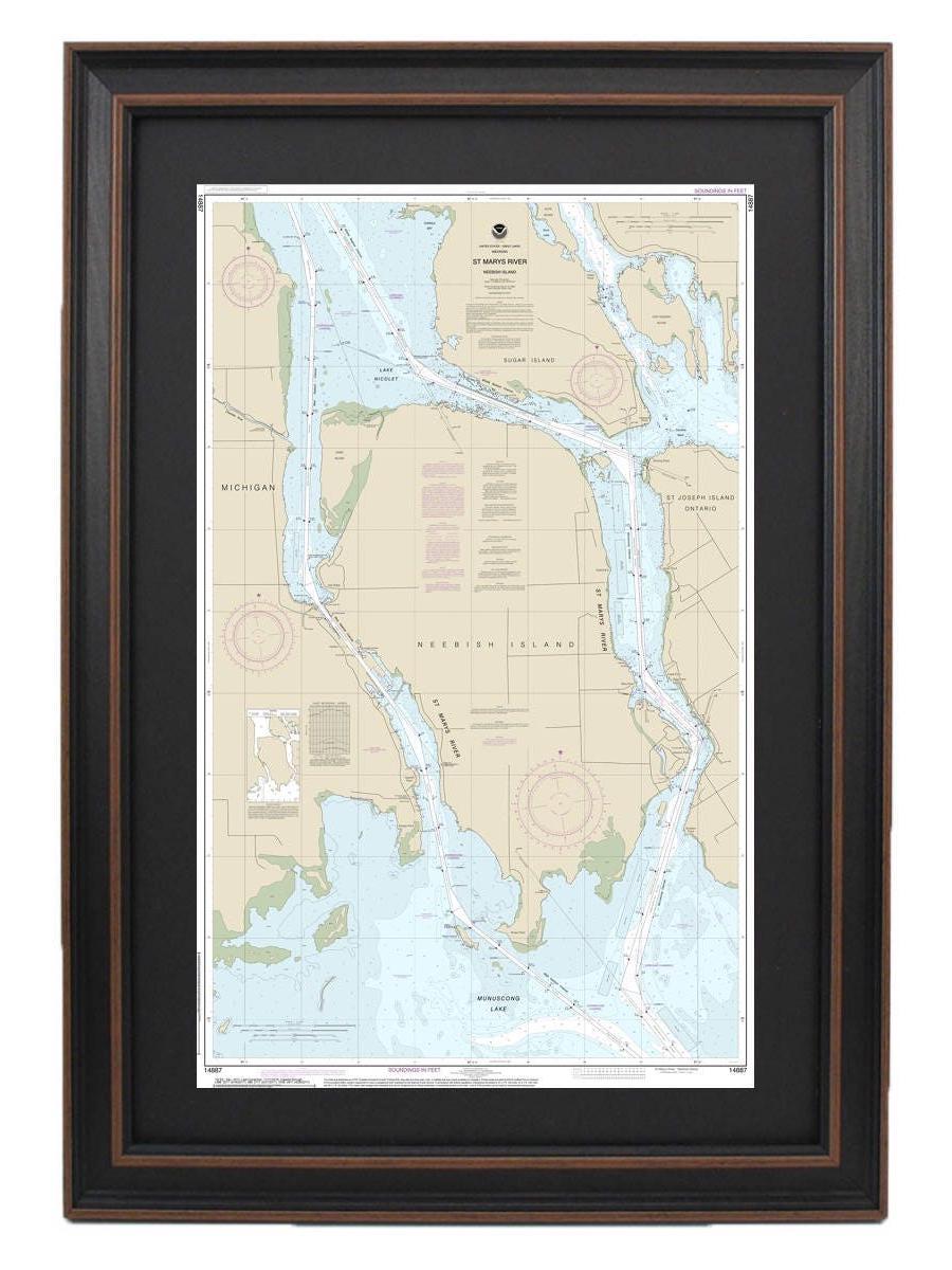 Framed Nautical Chart 14887 - St Marys River - Neebish Island, Michigan. NOAA 14887. Handmade in the USA.